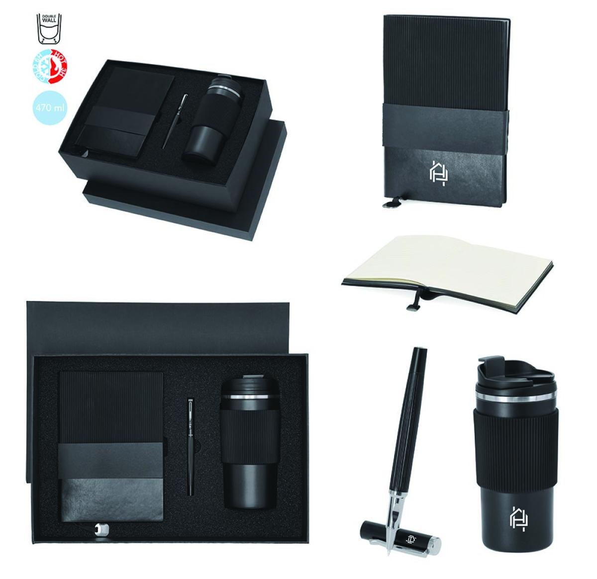 Elegant premium set including:470 ml capacity, double walled stainless steel thermos tumbler in elegant black. With matching lid dispenser and easy-opener, BPA-free, matching silicone band and non-slip base.?Soft cover notepad made of smooth PU leather in an elegant black colour, combining smooth and bevelled textures. Including fabric bookmark and a special metal plate for laser engraving. Inside with 100 sheets, in cream colour, with single-striped layout and black edges. Roller pen in matt black finish with silver metallic details. Bevelled barrel, hooded, clip and in blue ink. It includes a comfortable grip made from polished metal. Set presented in an individual matte-finish case, with inner die-cutting for each of the elements of the set.