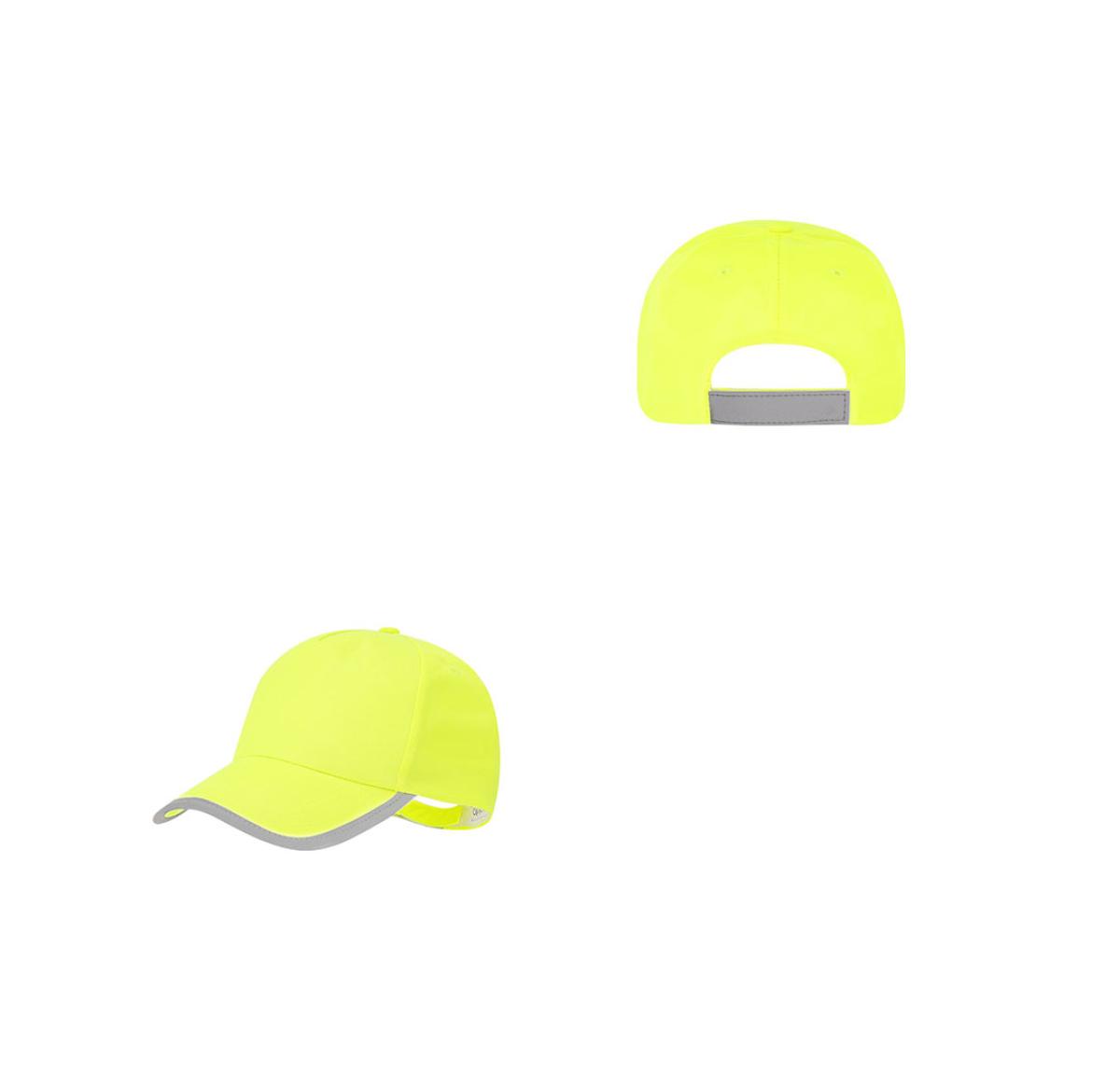 Children's sports cap made from soft polyester in a two-tone design with fluorescent yellow and reflective profile on the visor and closure. hook and loop closure and embroidered ventilation holes.