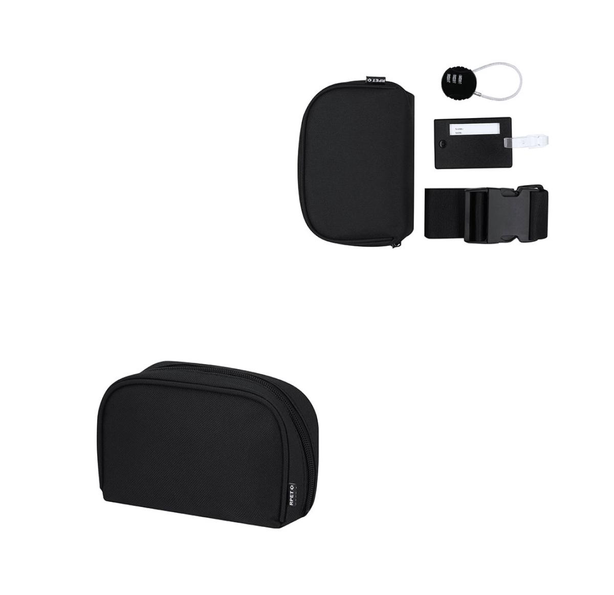 Travel set. Includes: adjustable strap for suitcases, luggage identifier, and a lock with a 3-digit numeric password and steel cable closure. Presented in a RPET case with zipper closure and double inner pocket. Includes RPET label. RPET material is made from recycled plastic to promote the reuse of plastic waste and help the planet's sustainability.