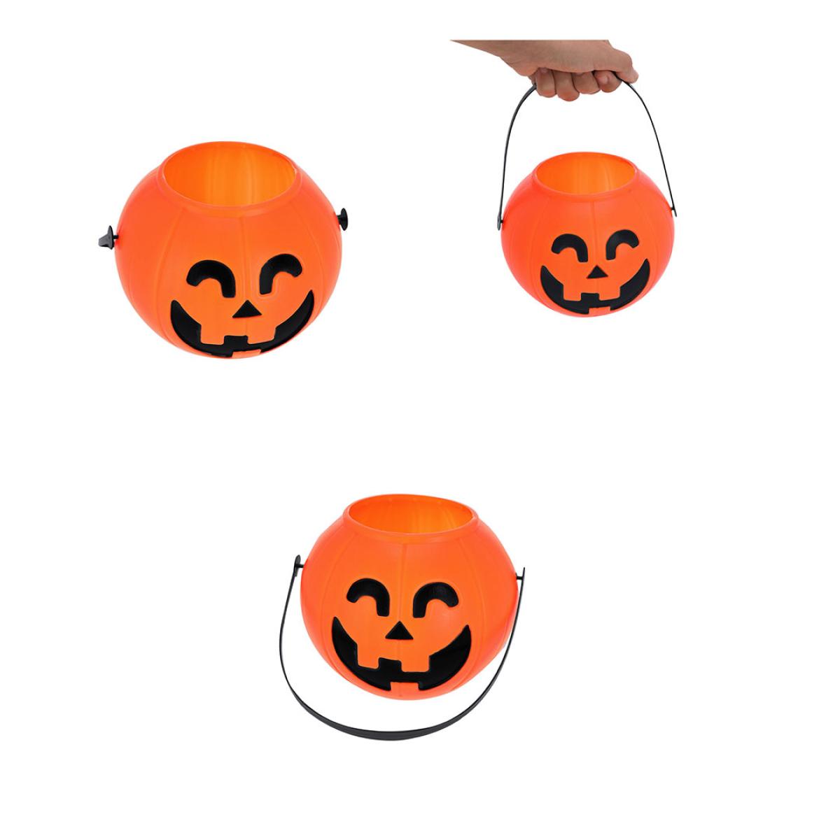 Halloween-themed basket designed in the shape of a pumpkin. Includes a handle for a comfortable grip.