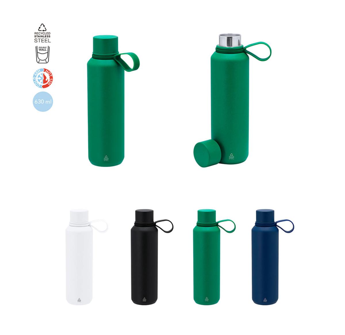 Thermal bottle with a capacity of 630 ml, made of Recycled Stainless Steel with double wall. Includes matching silicone handle. BPA-free. With a Recycled Stainless Steel label. Steel is one of the most demanded materials and can be found almost everywhere, from daily-use products to large constructions. With countless properties, among which durability and high level of reusability stand out, making it a highly valued alternative in sustainability solutions. Properly treated, it allows obtaining new resources of infinite use.