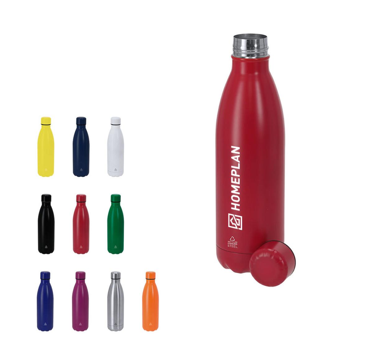 Thermal bottle with a capacity of 790 ml, made of Recycled Stainless Steel. With a matte finish. Includes a Recycled Stainless Steel label. Steel is one of the most demanded materials and can be found almost everywhere, from daily-use products to large constructions. With countless properties, among which durability and high level of reusability stand out, making it a highly valued alternative in sustainability solutions. Properly treated, it allows obtaining new resources of infinite use.