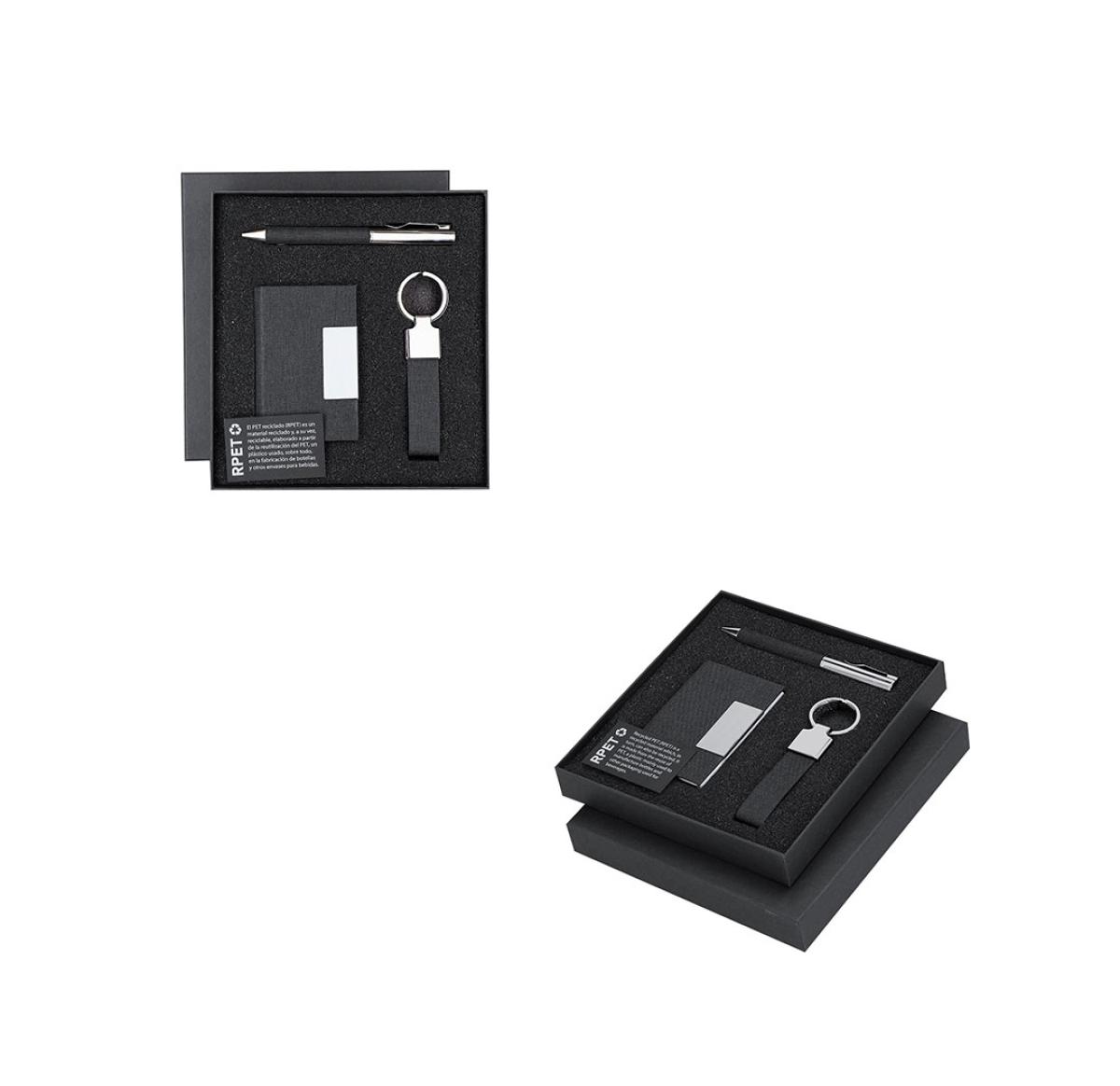 Elegant set in RPET with black bitone finish and metallic details. Includes: -RPET cardholder with black bitone exterior combined and metallic detail, 1 interior compartment and magnetic closure system. -RPET pen with black bitone finish and metallic details. With rotating mechanism and blue ink. -RPET keychain with black bitone finish and chrome accessories. Presented in an individual black case. Includes a black inner card with RPET label. RPET material is made from recycled plastic to promote the reuse of plastic waste and help the sustainability of the planet.
