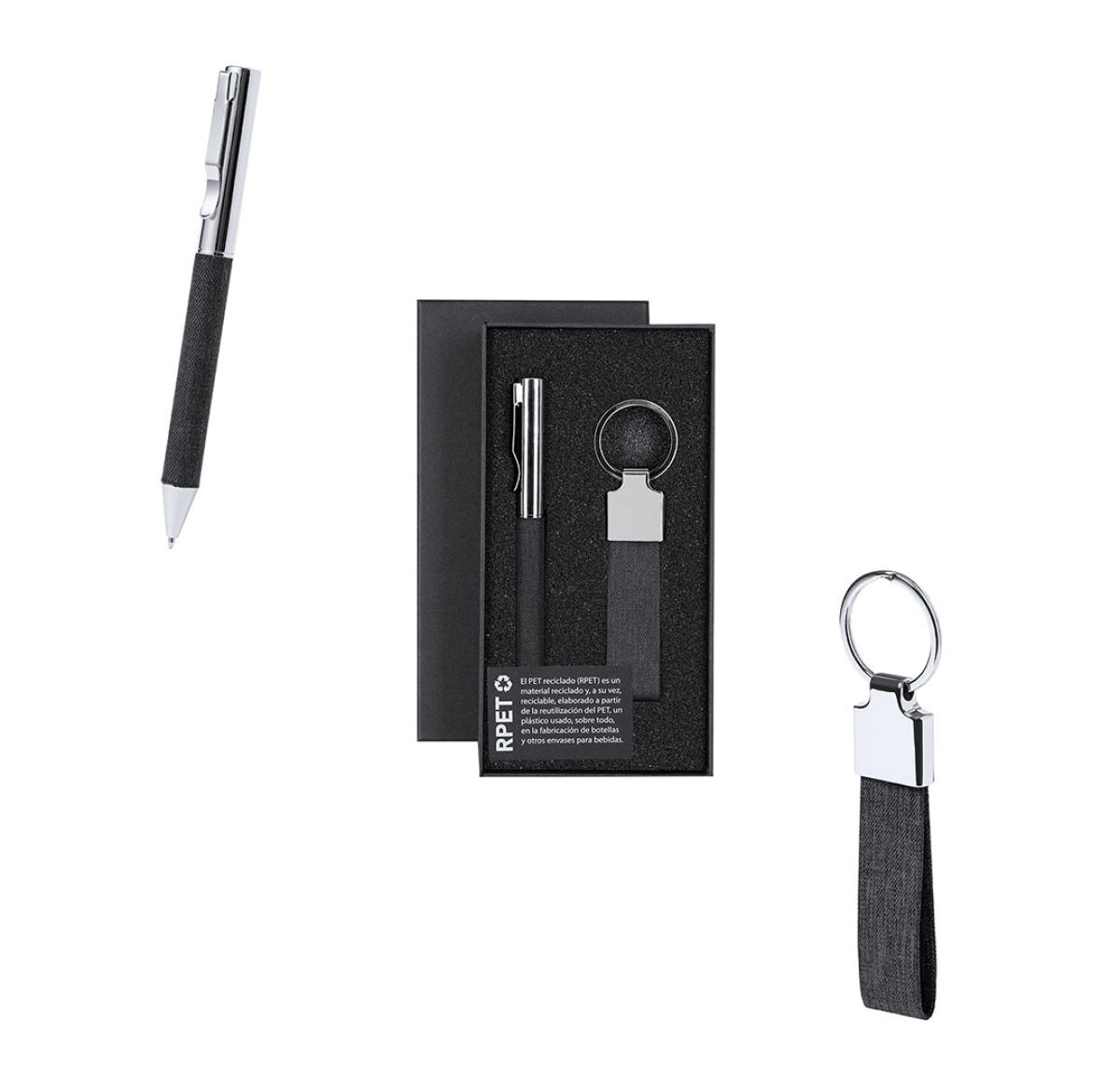 Elegant set in RPET with black bitone finish and metallic details. Includes: -RPET pen with black bitone finish and metallic details. With rotating mechanism and blue ink. -RPET keychain with black bitone finish and chrome accessories. Presented in an individual black case. Includes a black inner card with RPET label. RPET material is made from recycled plastic to promote the reuse of plastic waste and help the sustainability of the planet.