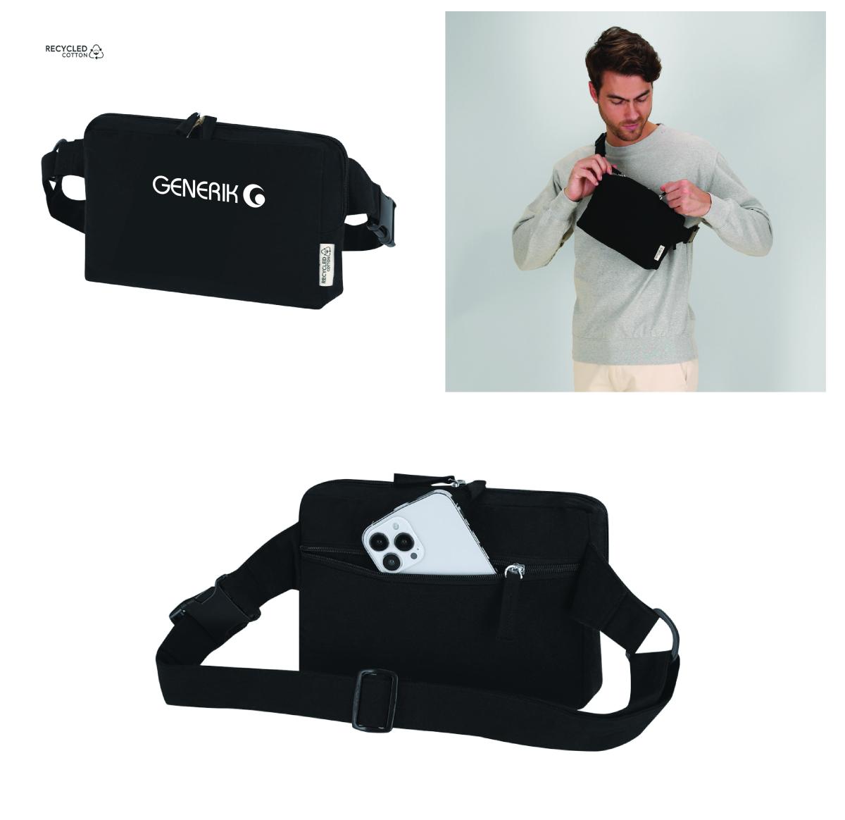 Rectangular belt bag in recycled cotton. With central pocket with zip closure, double puller and adjustable strap with matching buckle closure. Also includes a pocket on the back. With recycled cotton badge.
