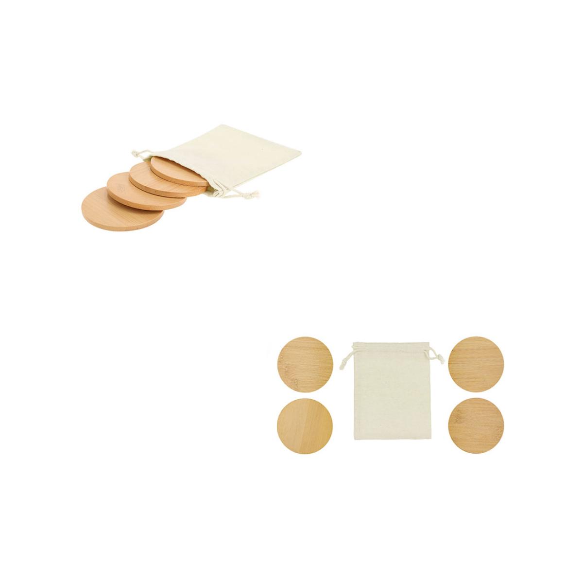 Bamboo coaster set. Includes 4 coasters. Presented in a cotton bag with drawstring closure.