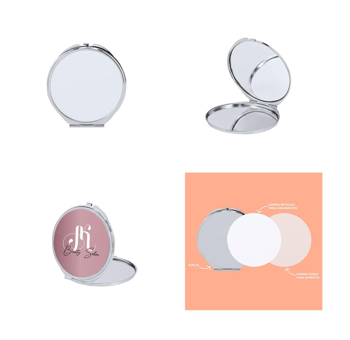 Folding metal mirror with an area for sublimation (not integrated into the product, ideal for printing and applying later). With two interior mirrors: 1X and 2X magnification.