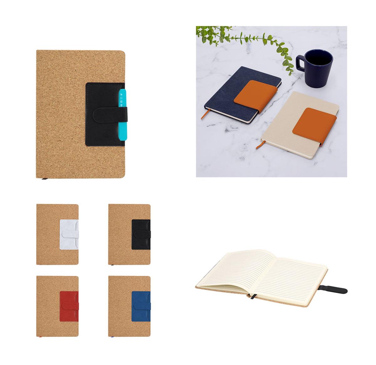Notepad with rigid covers combining natural cork and PU. Includes PU pocket on the cover, ideal for cards. With magnetic closure, 80 pages with lined layout, and matching bookmark. Made with plant elements to promote the use of natural raw materials and reduce polluting emissions.