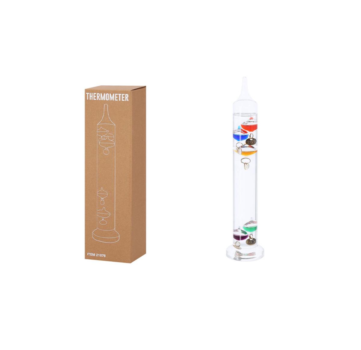 Galileo thermometer in borosilicate glass with elegant and compact design. With 5 coloured glass bulbs (purple, green, orange, blue, and red) indicating temperatures in ?C and ?F through gold labels, which move along the thermometer according to the outside temperature.