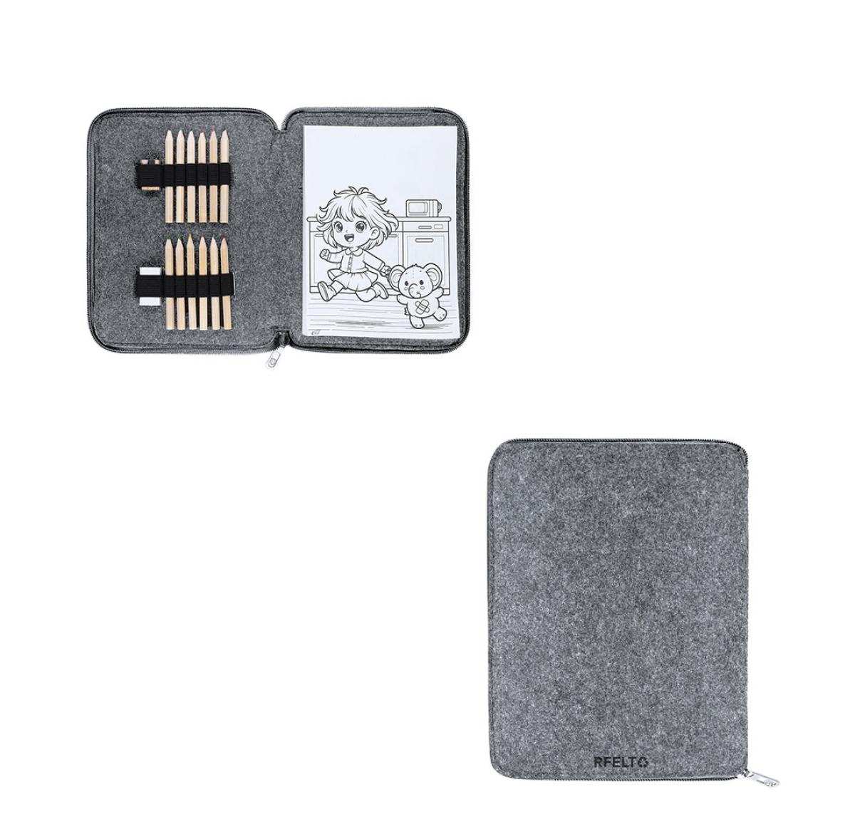 colour pencil set in a case made from RPET felt. Includes 11 hexagonal coloured pencils, 1 eraser, 1 wooden sharpener, and 60 pages with fun black and white designs for colouring. Presented in a practical case with a zipper closure in a bi-colour design and an interior with elastic bands to organize accessories. With RPET label. RPET felt is the result of the combination of the recycling process of plastic materials along with the ancient technique of felt manufacturing, resulting in an eco-trending material that, besides being recycled, is also recyclable.