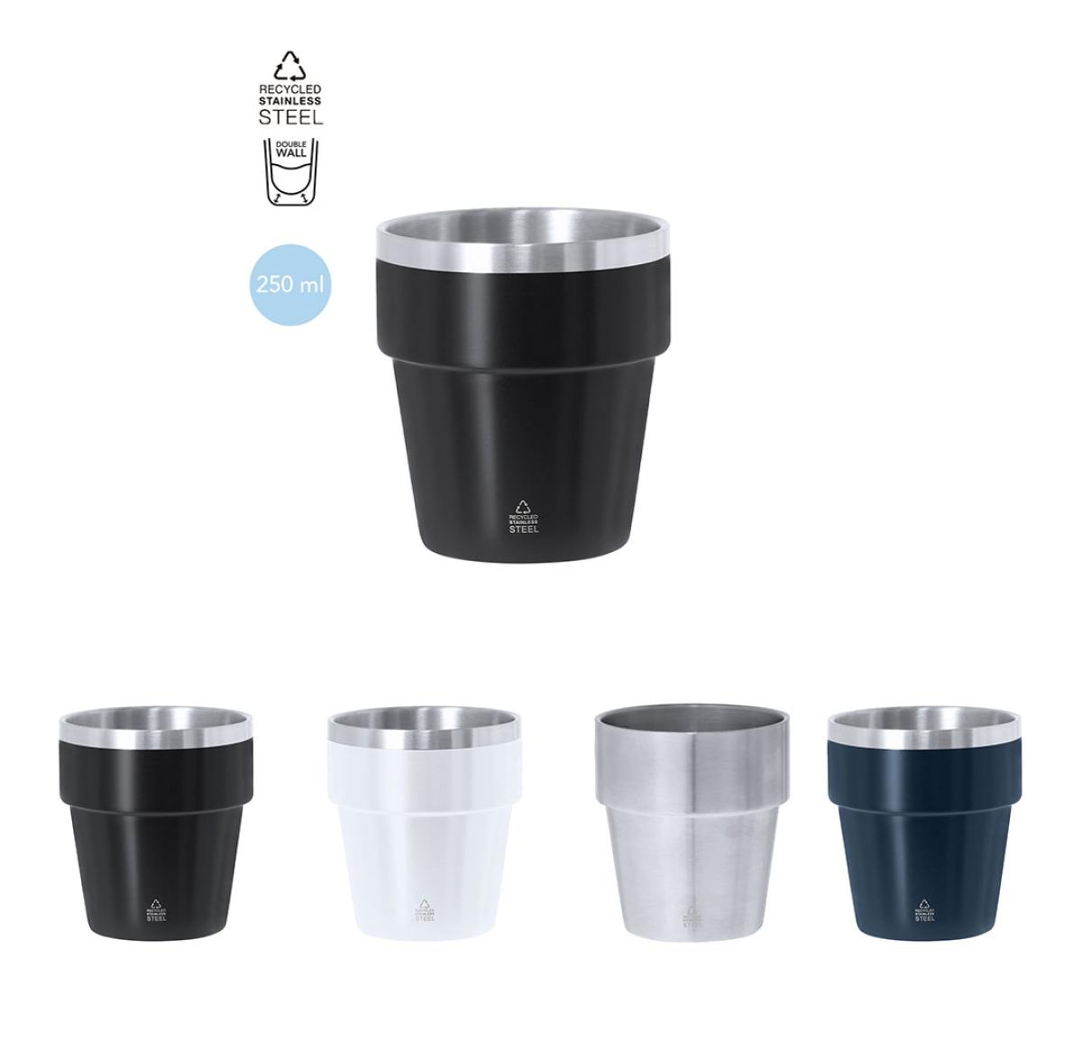 Thermal cup made from recycled stainless steel with double wall and 250 ml capacity. Coating in satin colour and edge and interior in satin stainless colour. With recycled stainless steel logo. Stainless steel is one of the most demanded materials and can be found almost everywhere, from daily use products to large constructions. With countless properties, including durability and a high degree of reuse, making it a highly valued alternative in sustainability solutions. Properly treated, it allows for obtaining new resources of infinite use.