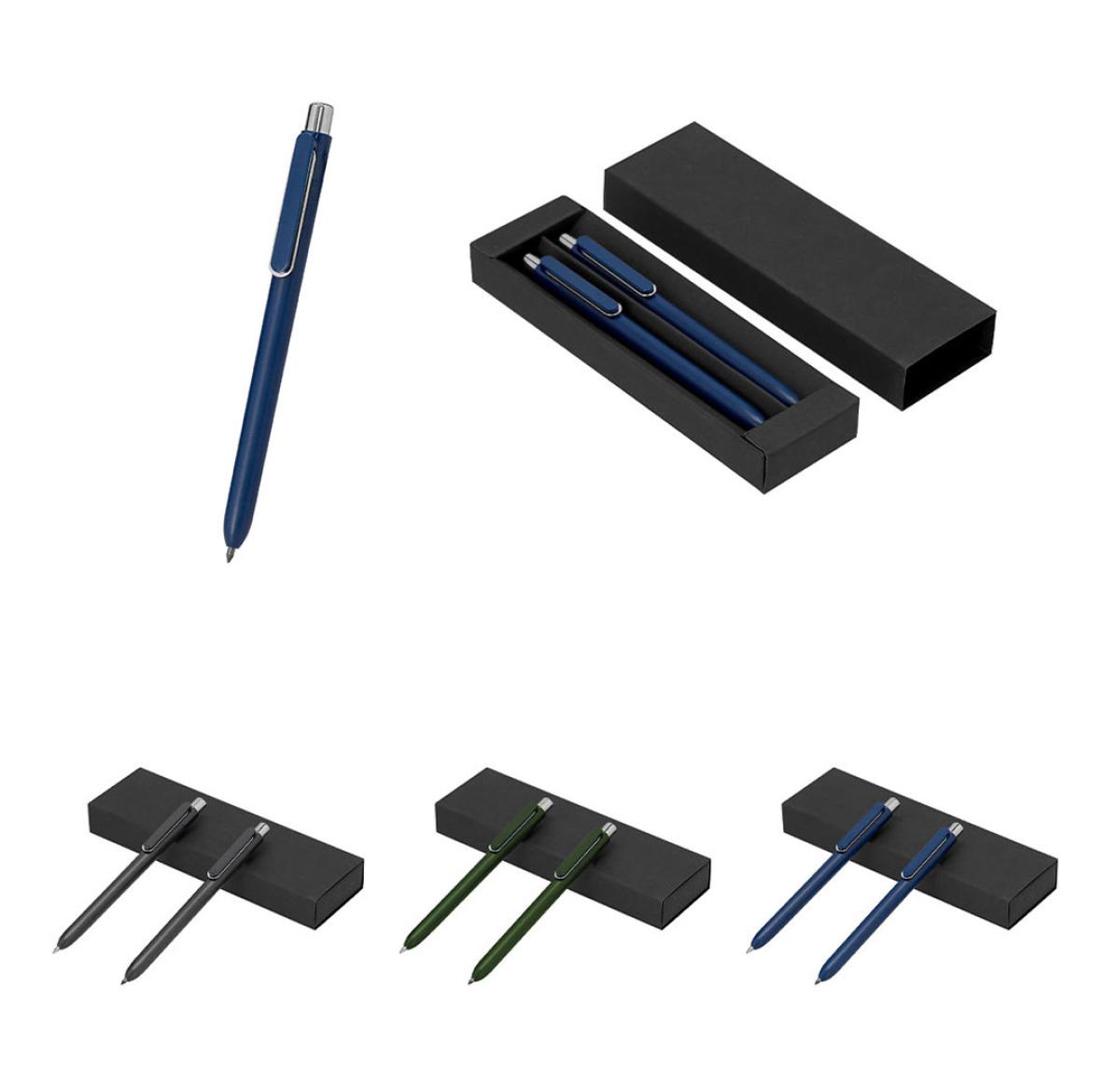 Set consisting of a blue ink pen and an eternal pencil, both made from RABS. The eternal pencil offers continuous writing, avoiding waste generation, and both have a push mechanism. Designed with matching clip and chrome details. Presented in a recycled black cardboard case. With RABS printed label.