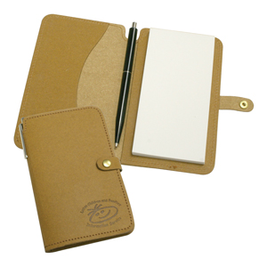 Recycled bonded leather jotter pad with pen and stud fastening. This natural finish material can vary slightly in colour.