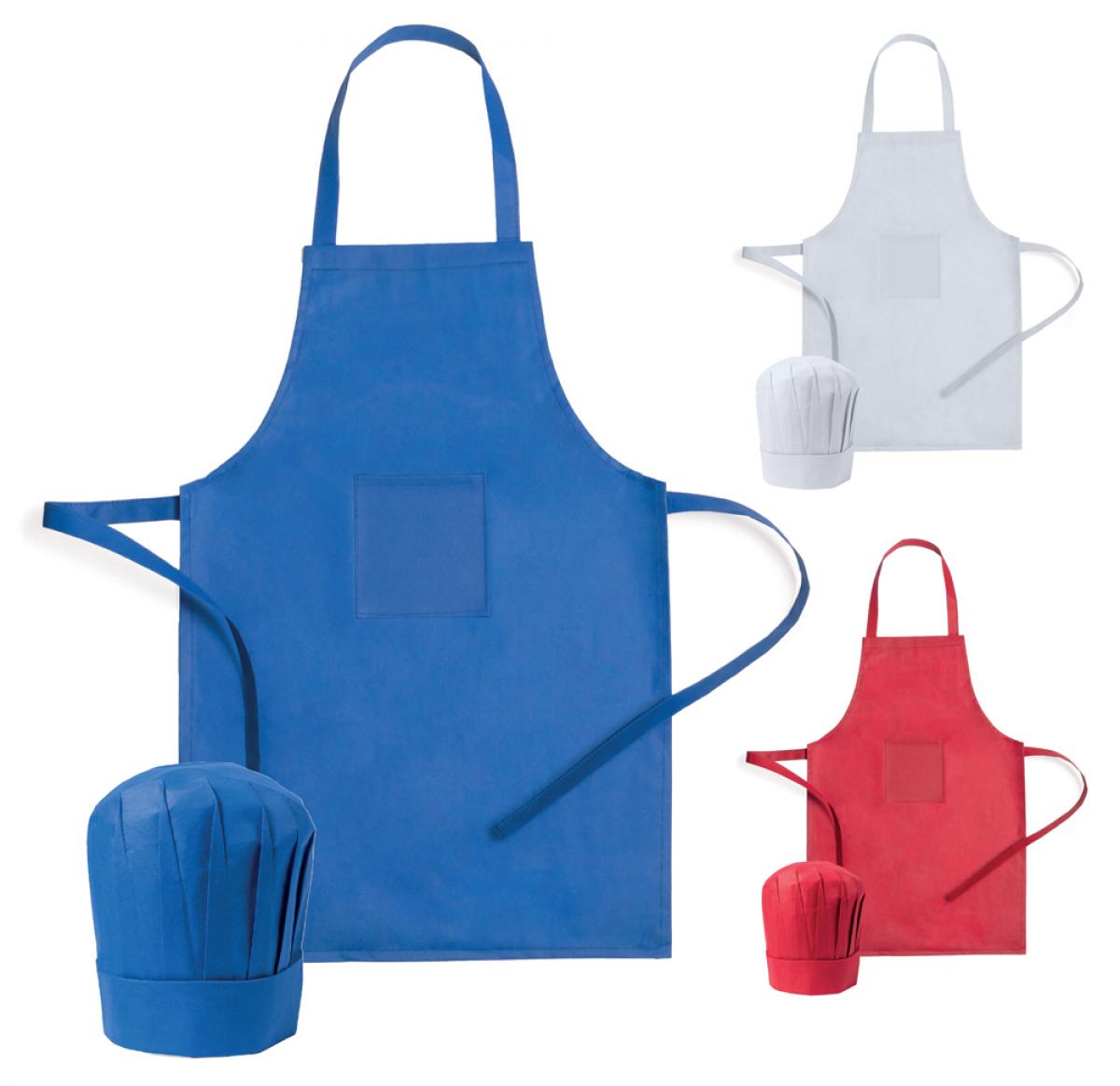 Non-woven childrens chef set including chef hat and apron with front pocket. One size.