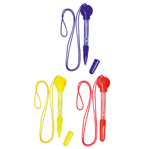 Capped ballpoint pen for blowing bubbles, on a neck cord. Liquid not included. Blue ink.