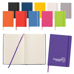 Soft feel A4 note book with cream coloured lined pages, ribbon page marker and elasticated closure.