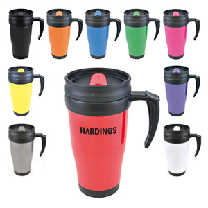 0.45 litre capacity thermal travel mug with coloured drinking lip.