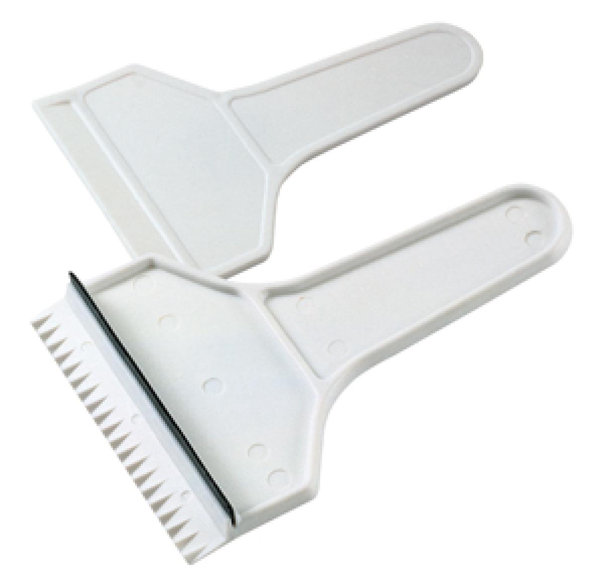 White plastic ice scraper with rubber blade.