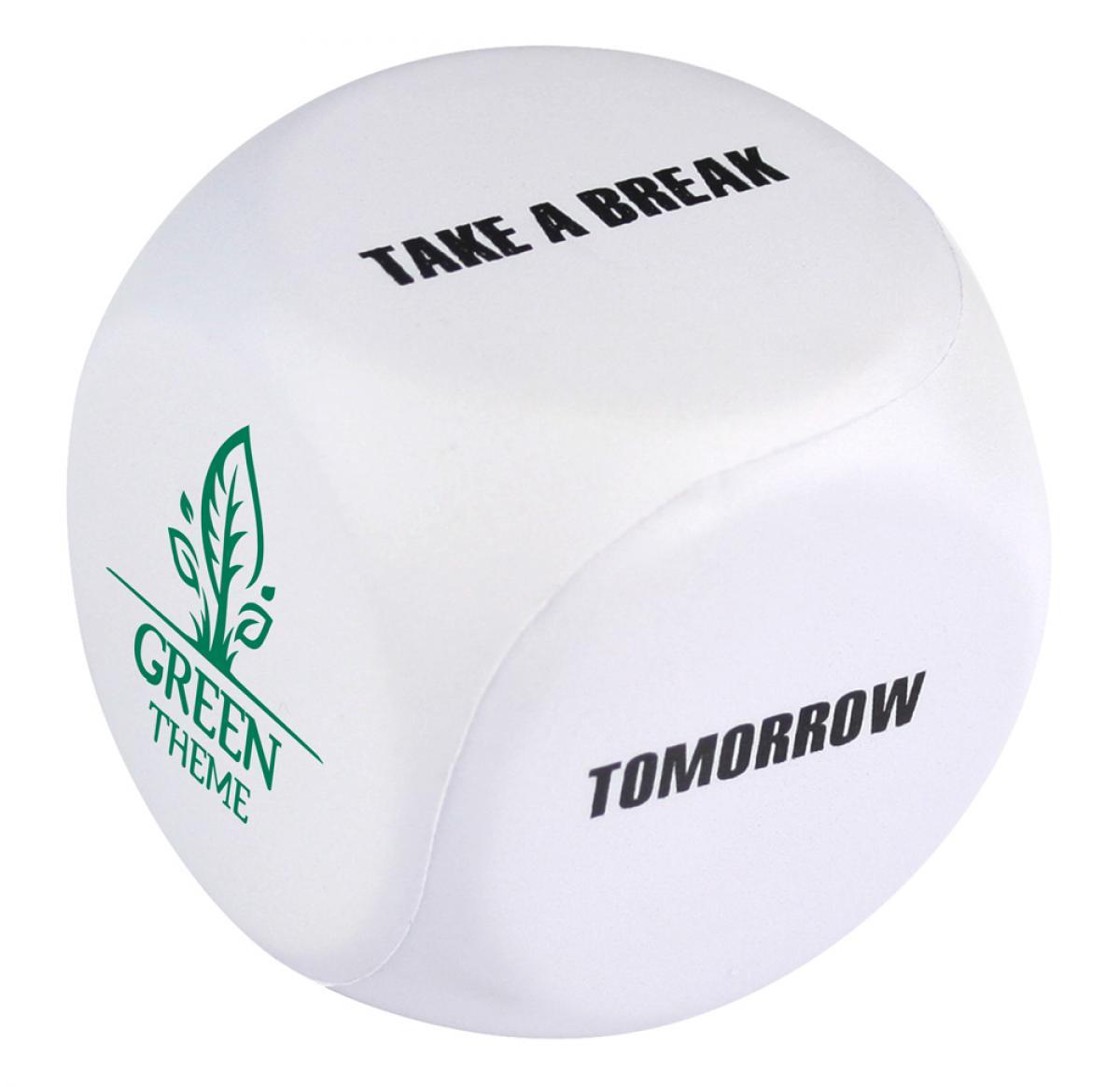 Stress reliever decision dice, five sides of variables with one side plain for your company logo or slogan.
