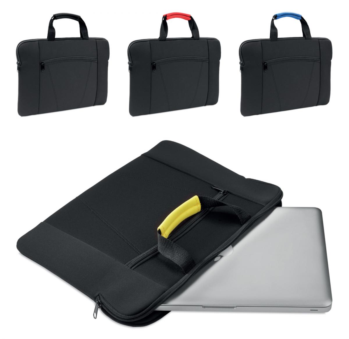Softshell laptop bag with zipped pocket and coloured carry handle.