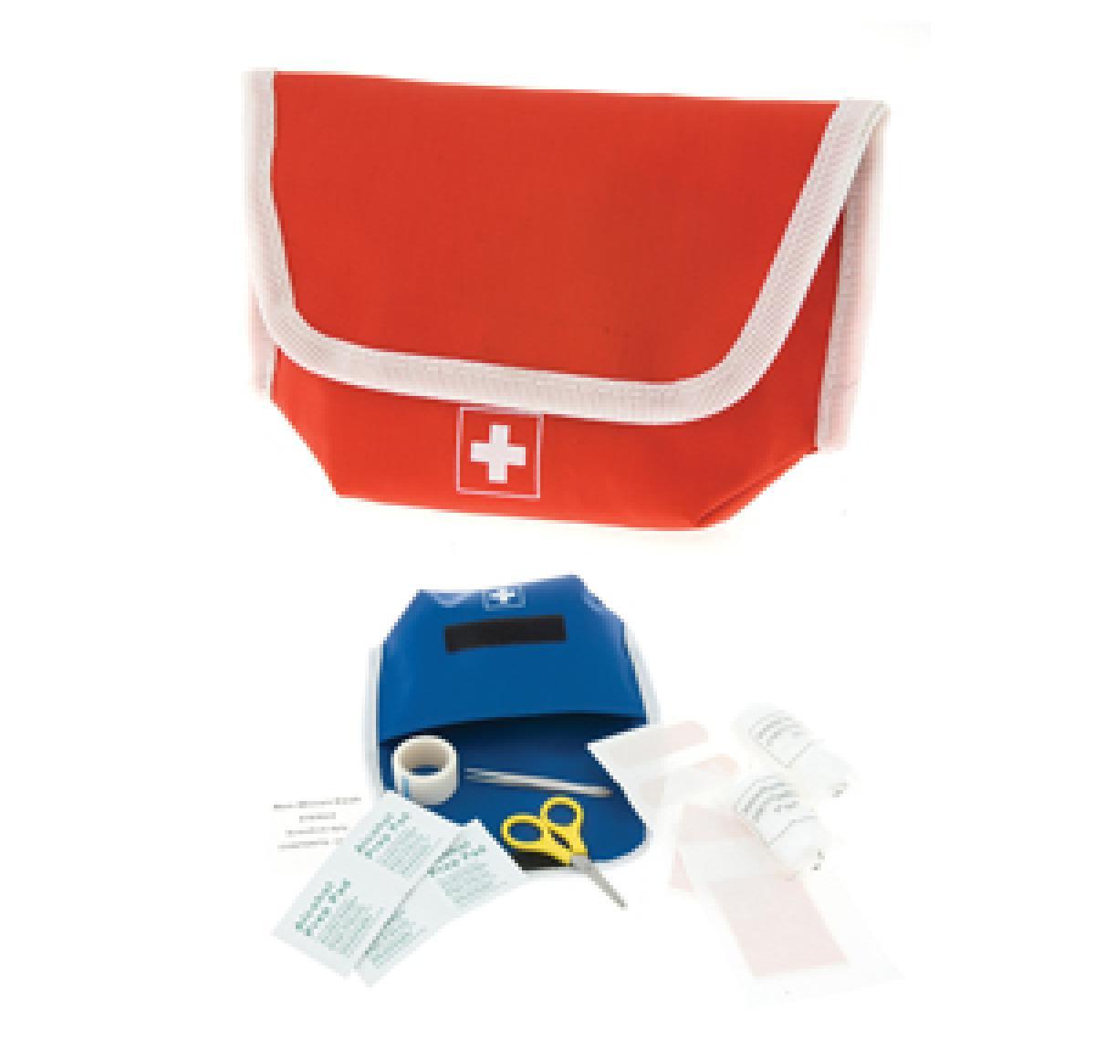 Emergency first aid kit in a 600D polyester pouch with Velcro fastening and 17 accessories (1 x scissors, 1 x tweezers, 1 x bandage 3m x 7cm, 1 x bandage 3m x 5cm, 1 x medical tape, 4 x alcohol wipes, 6 x plasters, 2 x non-woven swabs).