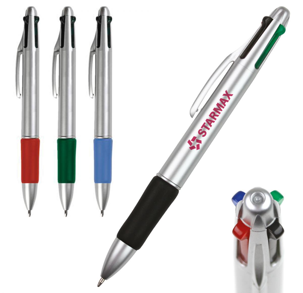Silver plastic 4 in 1 ballpoint pen with rubber grip. Includes black, blue, red and green ink.