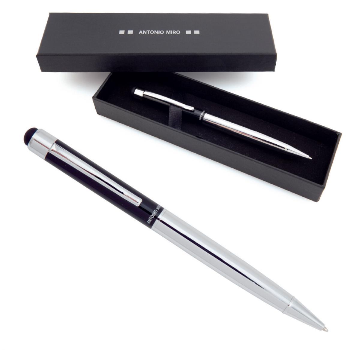 Executive metal pen with touch screen stylus in presentation box with blue ink.
