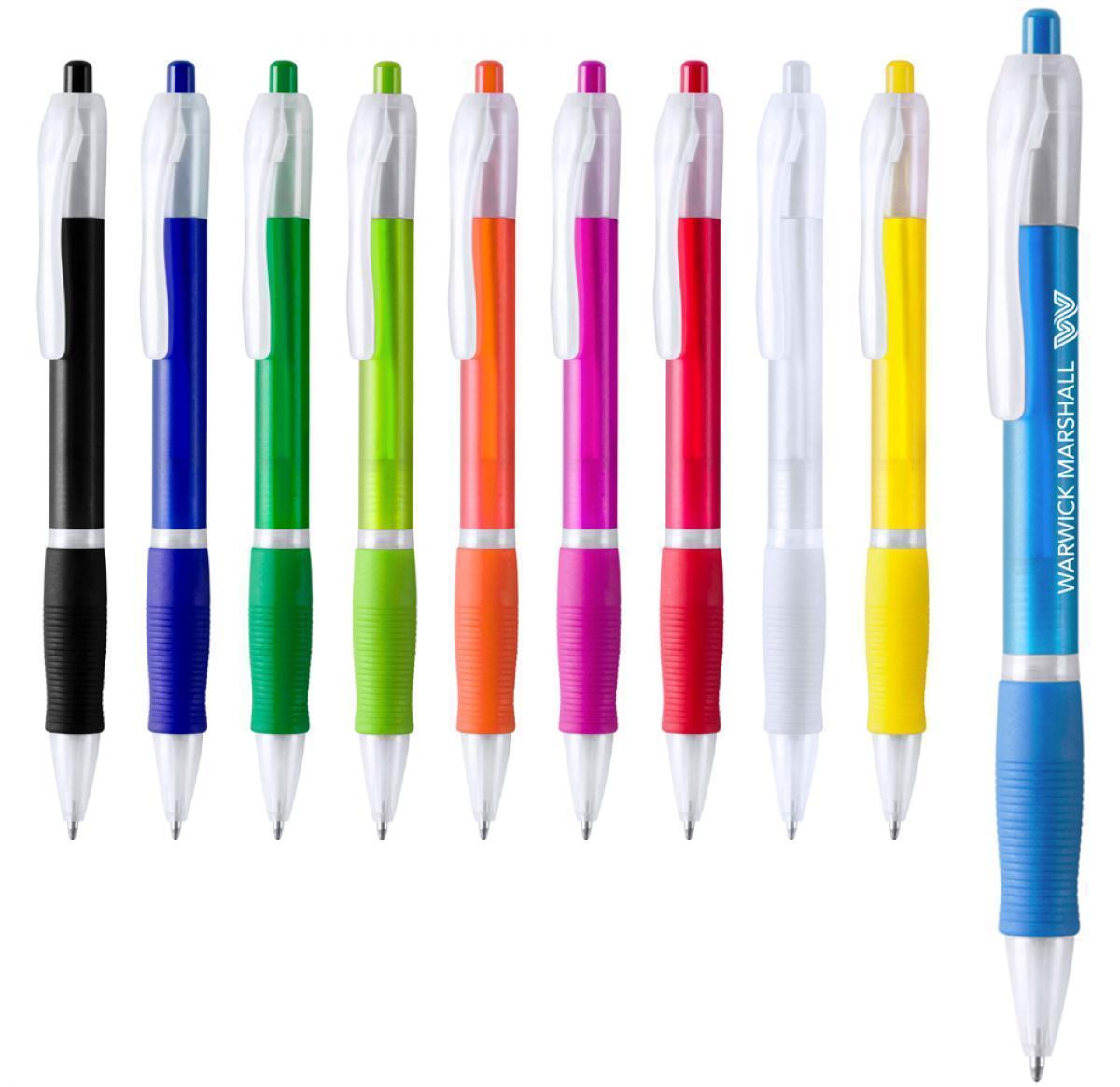 Retractable ballpoint pen with coloured clip and frosted grip.