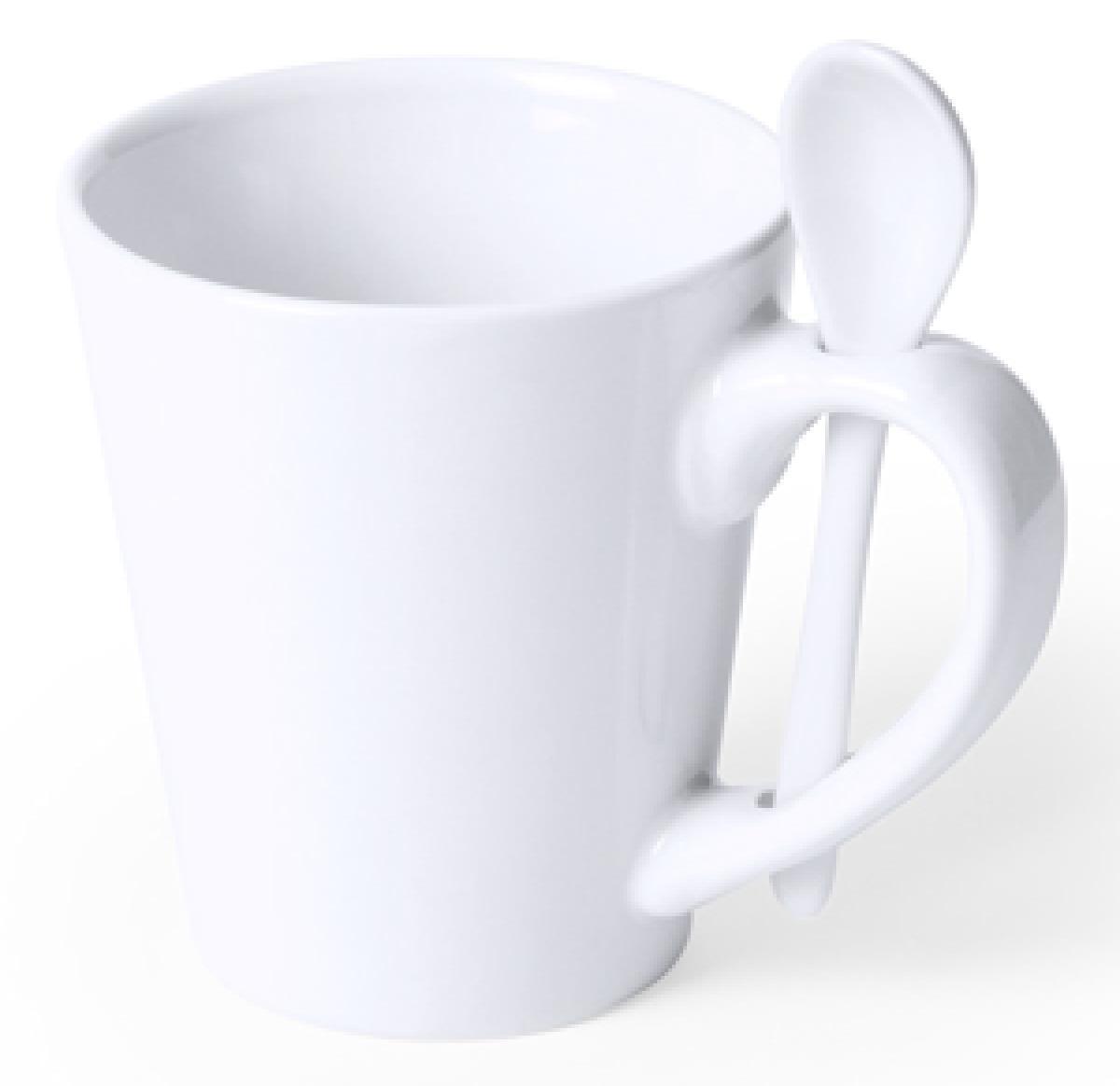 Ceramic 350ml mug and spoon suitable for dye sublimation.