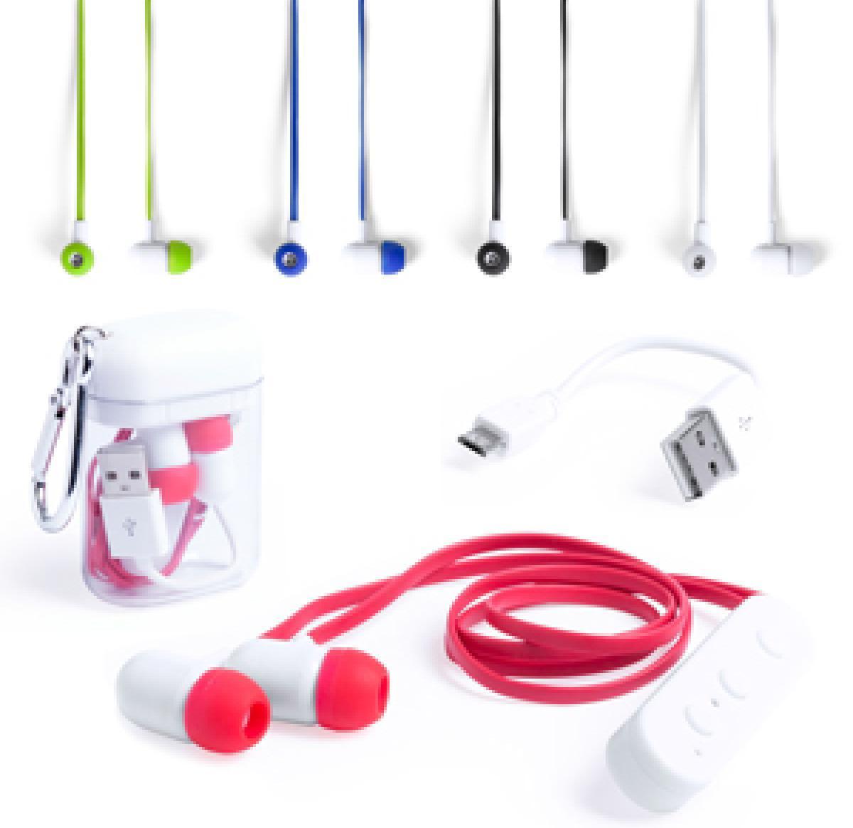 Wireless earphones with Bluetooth connection, volume control and USB rechargeable. Supplied in clear tub with carabineer clip. Cable included.