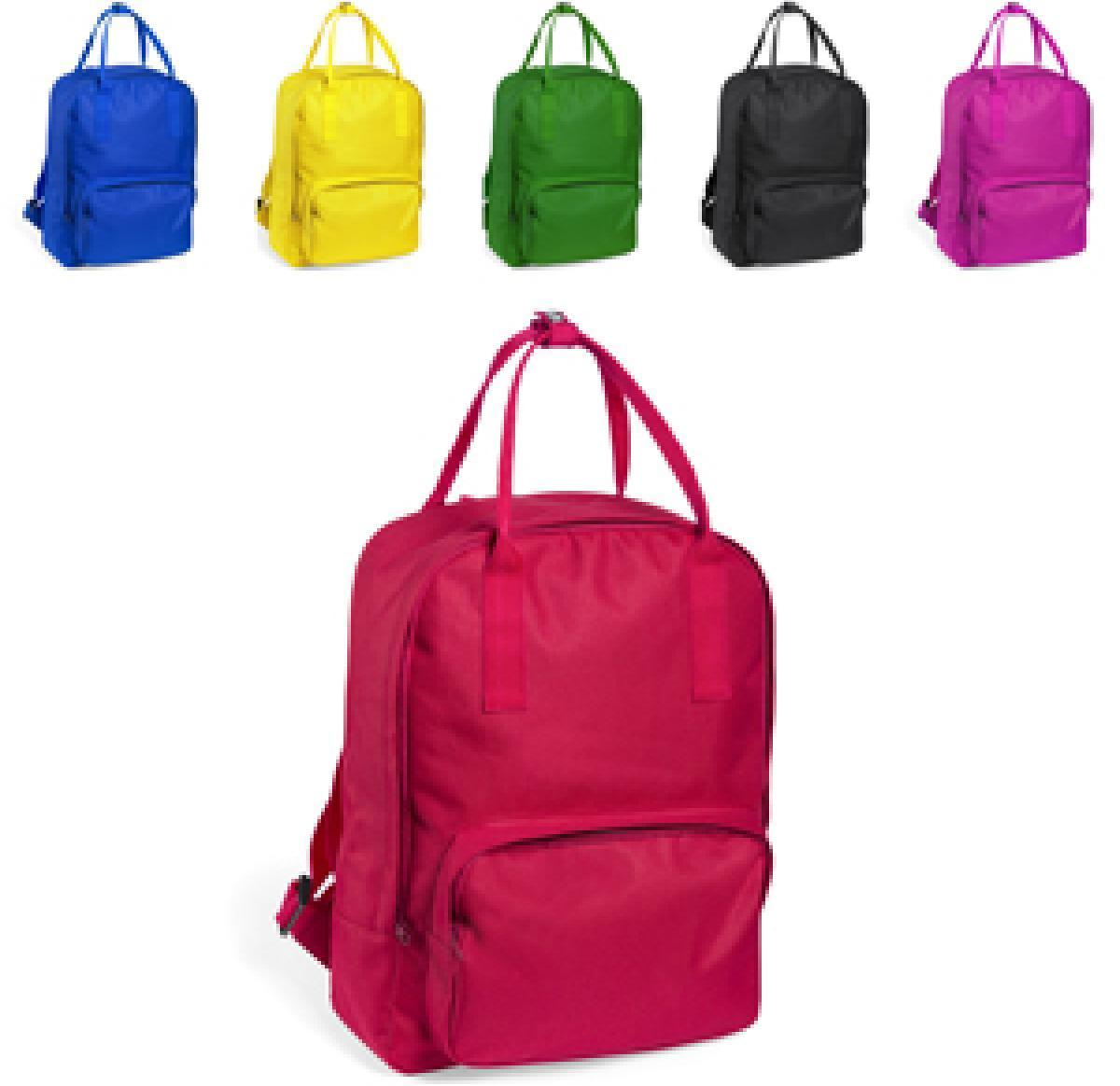 Polyester 600D backpack with adjustable straps, carry handle, main zipped compartment and front zipped pocket.