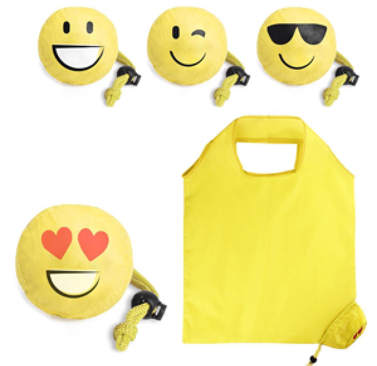 Folding polyester 190T yellow emoji bag. Supplied in smiley face, wink face, cool face and heart face.
