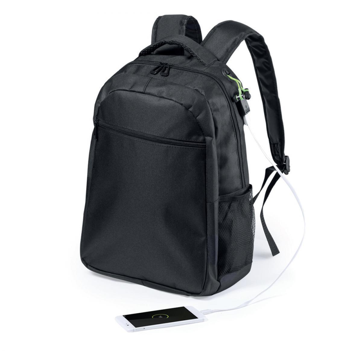 Polyester laptop and tablet bag with USB connection with padded back, padded shoulder straps, zipped main compartment, zipped front pocket, headphone port and mesh pocket on each side for holding drinking bottles.