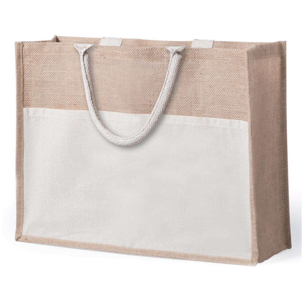 Jute and cotton shopping tote bag with long handles. This large bag has a large unzipped front pocket made of cotton. Perfect for everyday use and grocery shopping.