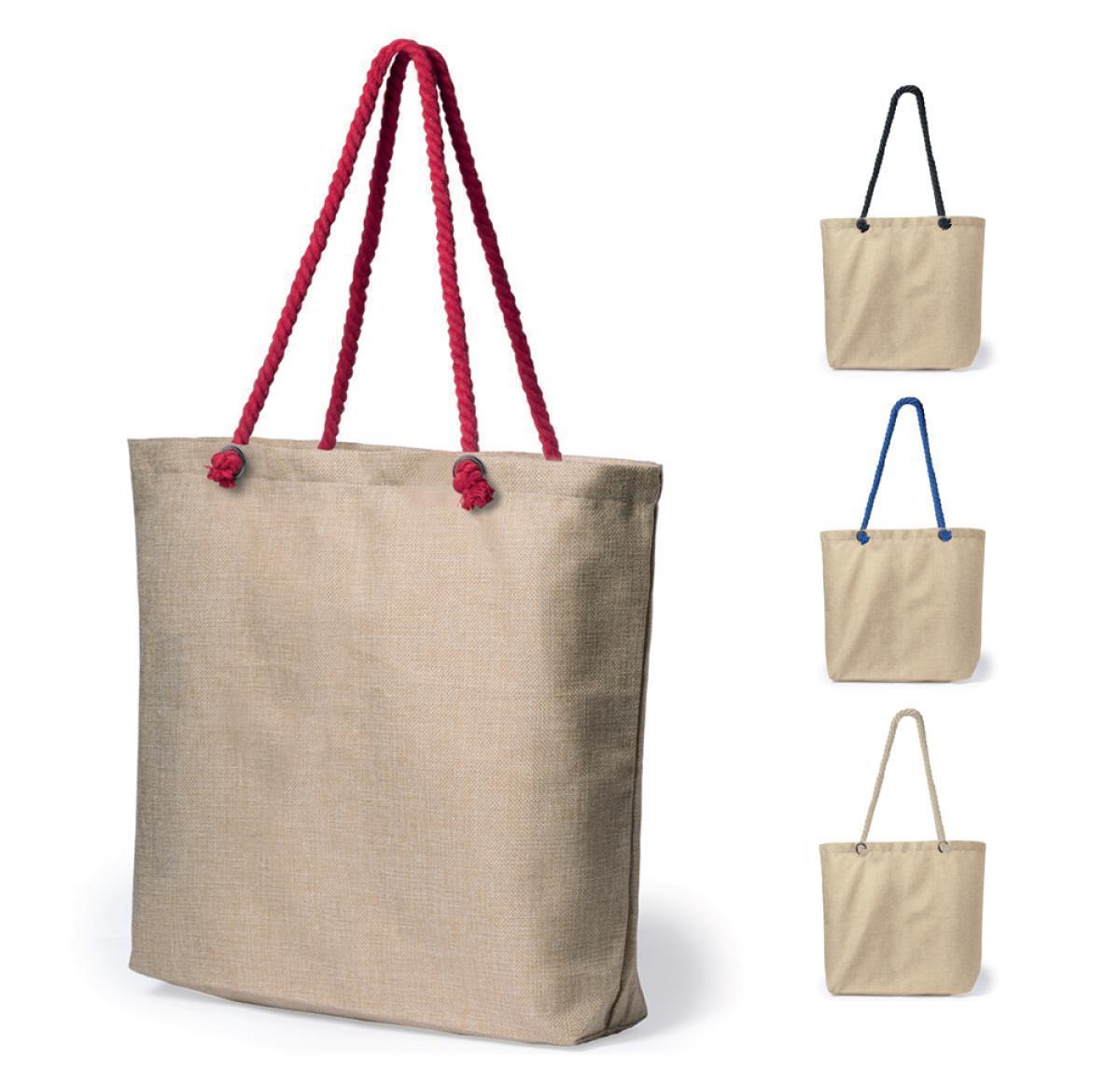Shopping tote bag with a jute body and long cotton handles. Perfect for everyday use and grocery shopping.