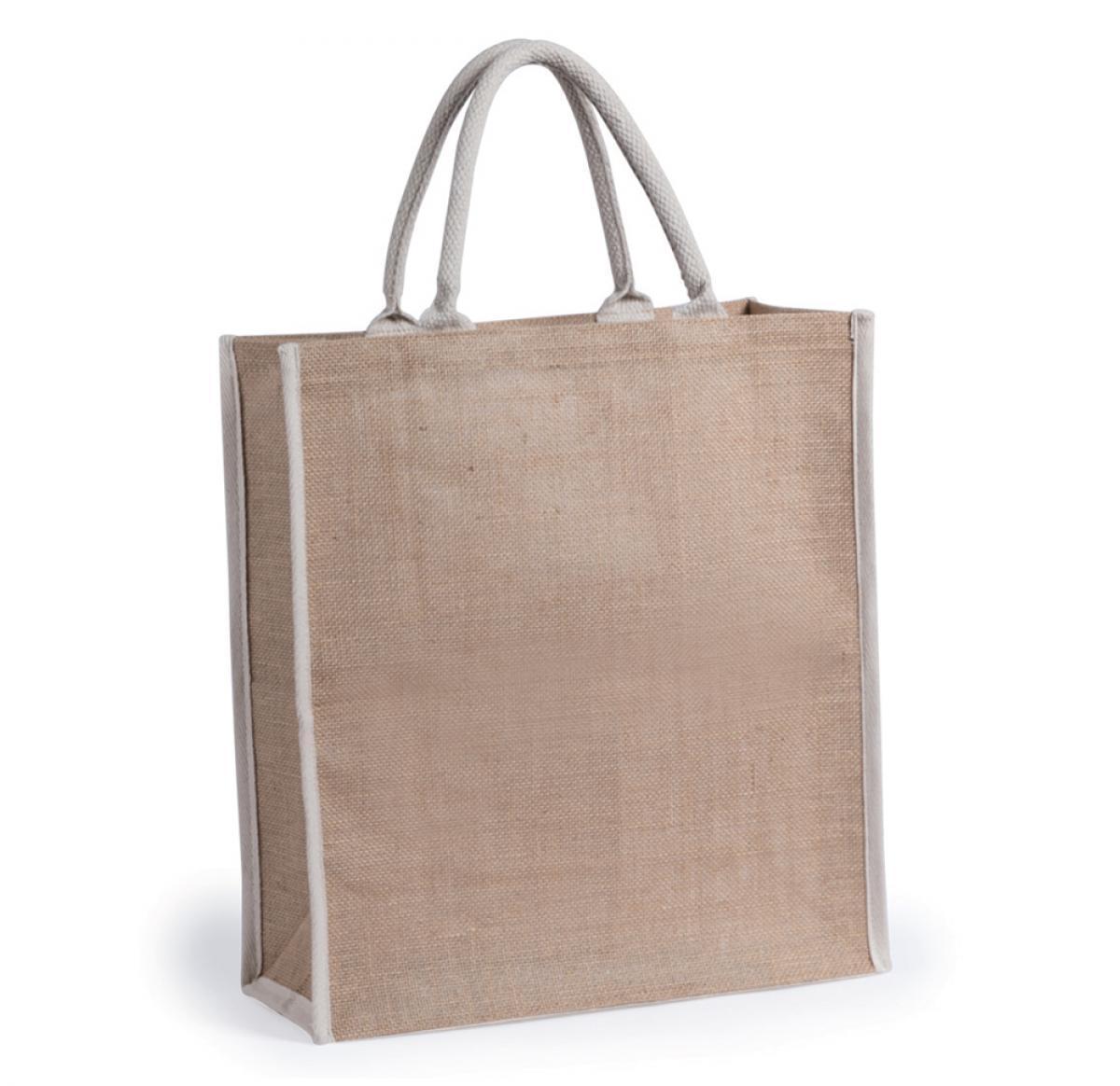 Shopping tote bag made with durable jute and cotton. Built in are two strong handles and a gusset to expand the bag. Ideal for grocery shopping.