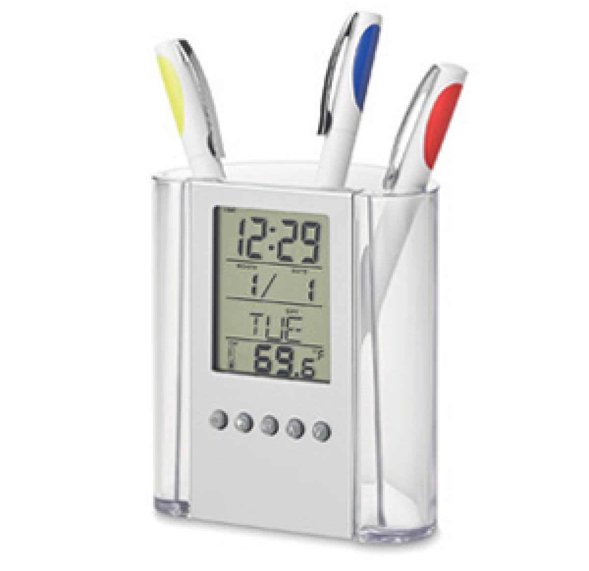 Pen Holder with clear casing. Digital clock includes the following features: alarm, calendar and thermometer.