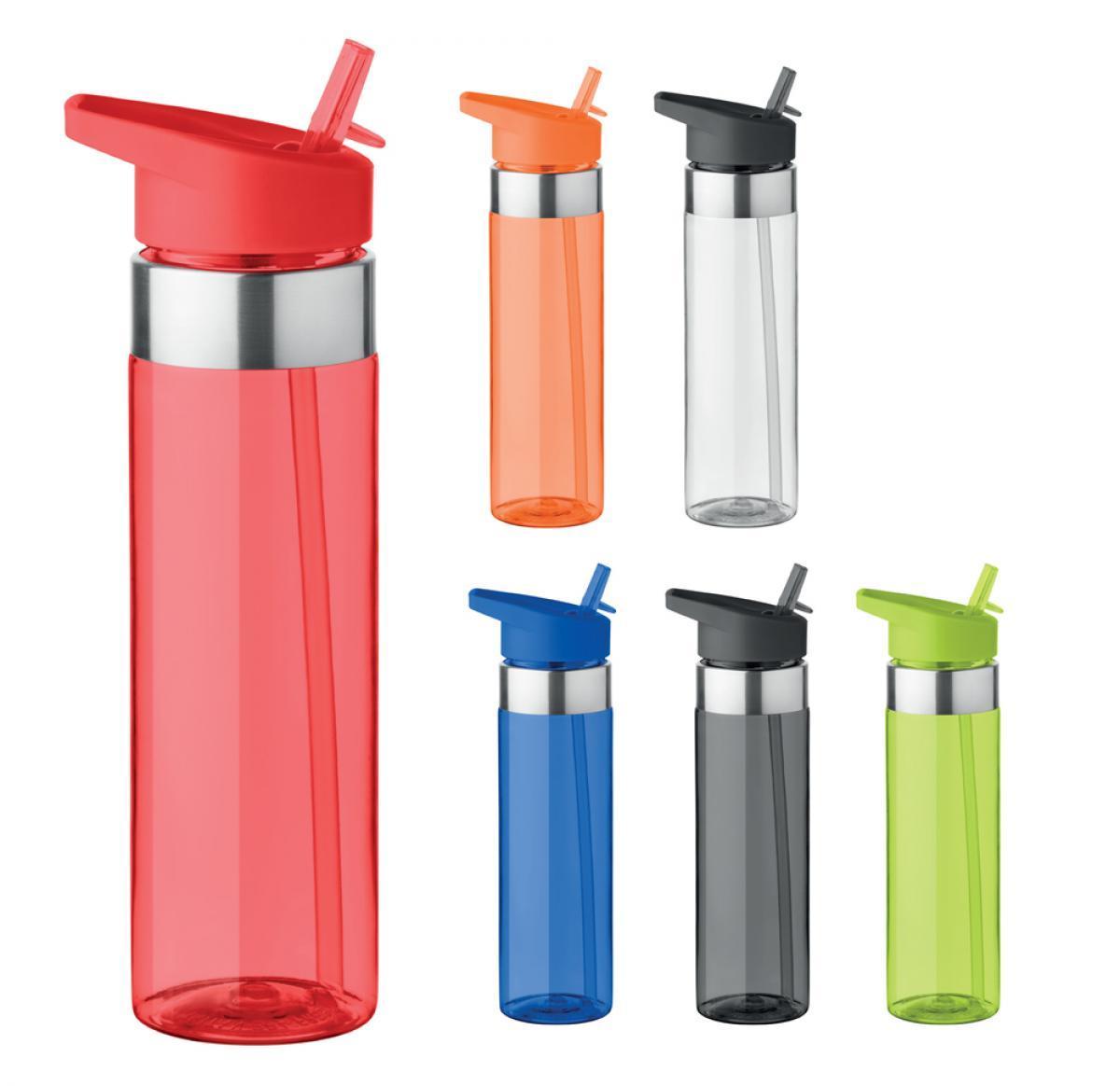 Transparent 650ml drinking sports bottle with foldable mouthpiece. BPA free plastic with a stainless-steel detail and a screw top closure.