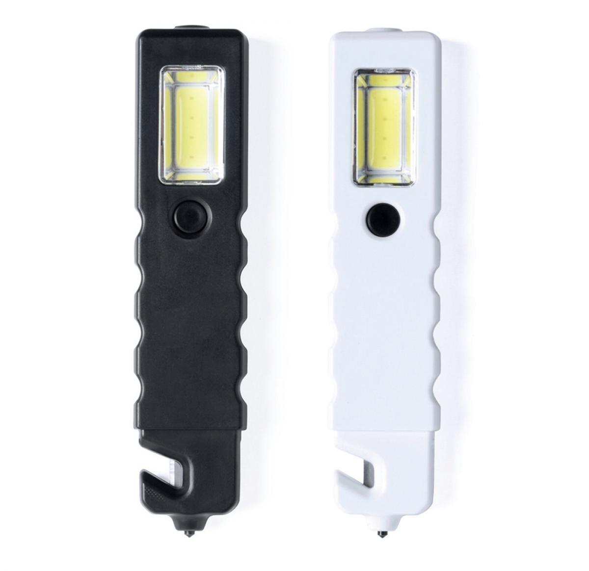 Multi-functional emergency hammer in black or white. Included in the tool is a LED torch, four COB lights and a magnet.