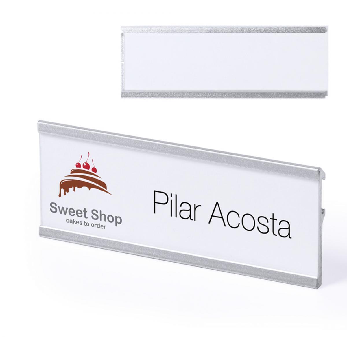Aluminium identity badge with safety pin fastener and slide clips for pockets. Large changeable front panel for names.