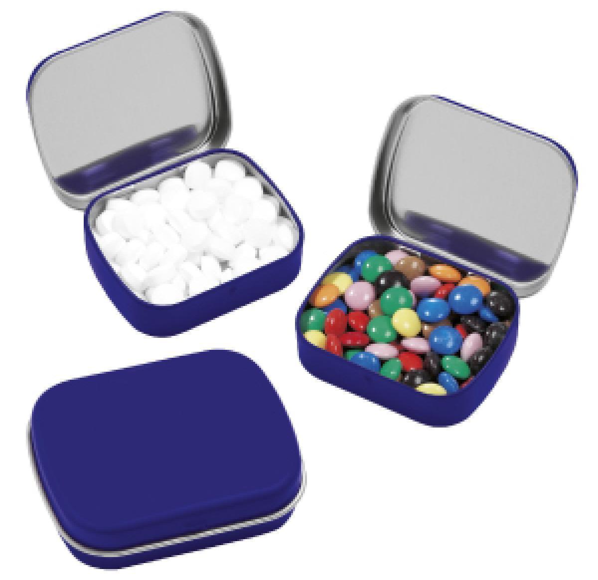 Small tin with approx. 25g of fresh peppermints/chocolates in a range of coloured Tins