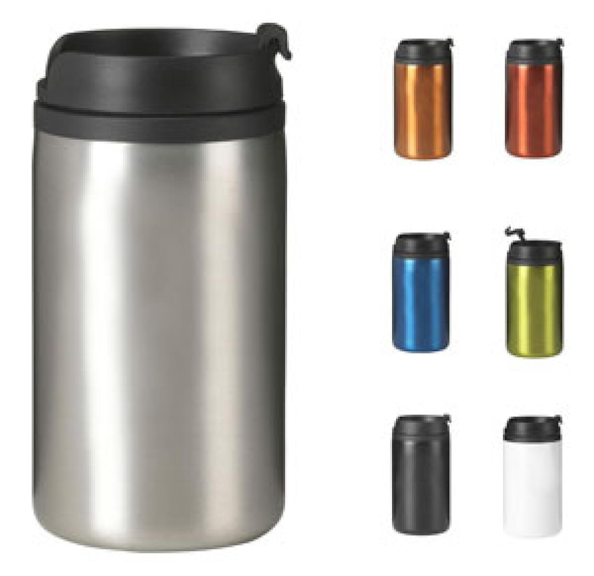 Stainless steel thermal mug with plastic inner and double walls for insulation. Leak free. Screw top lid with click opening. Not suitable for dishwasher use. 300ml capacity. Supplied individually boxed.