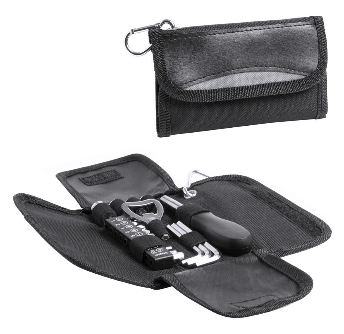 Tool set in a black storage pouch including 19 accessories. The pouch holds your accessories together with a hook and loop closure, and has a built in carabineer clip for convenient storage. Included is a bottle opener, hex keys and a screwdriver with changeable heads.