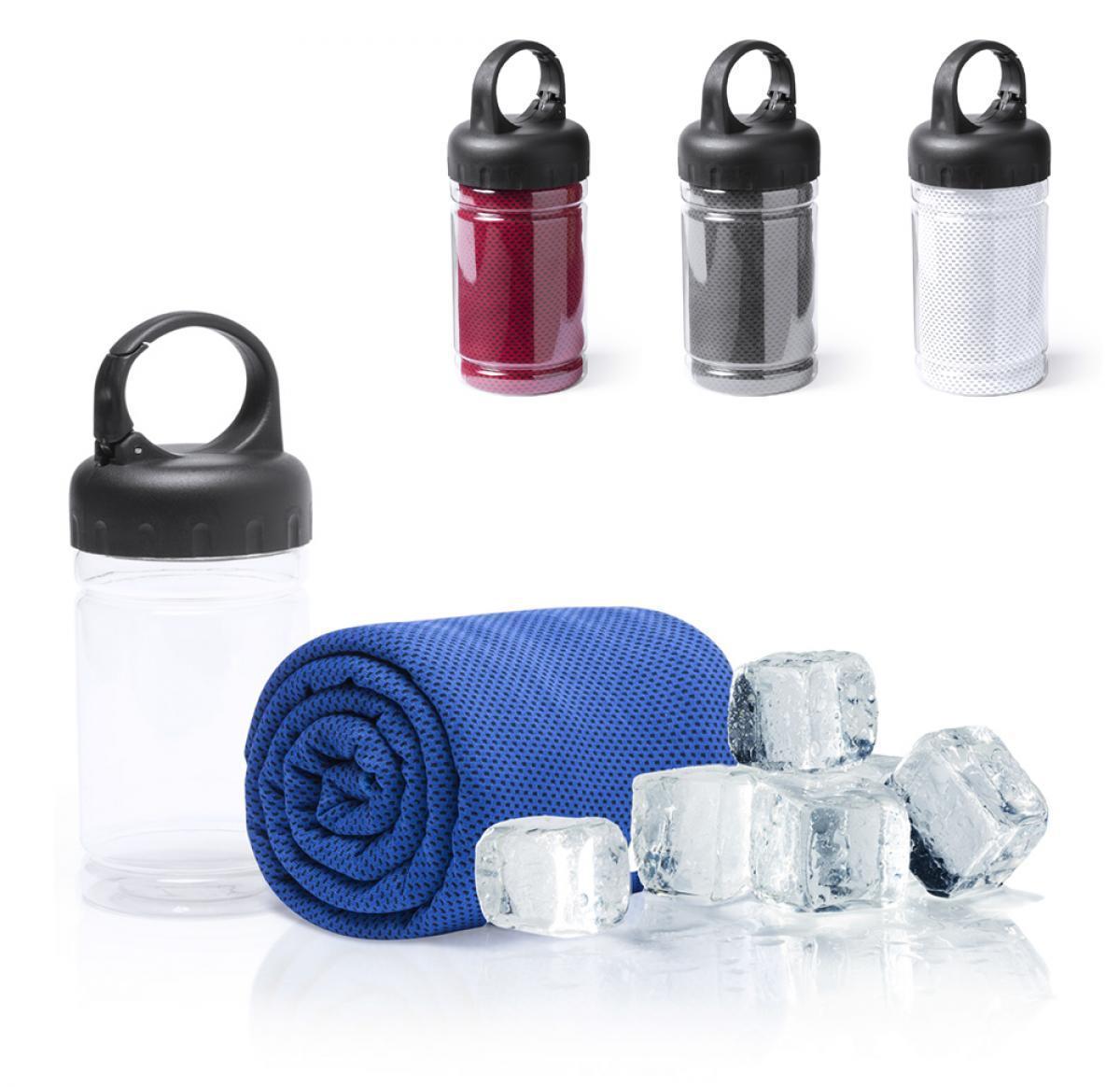 Towel in plastic screw cap container. Towel is made from 55% nylon and 45% polyester. The plastic container has a built in loop and clip. Ideal for sports and the gym.