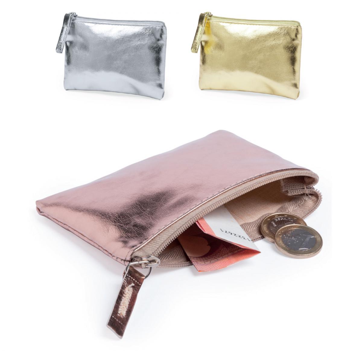 Coin purse in a metallic PU leather material, with a single main compartment and zipped closure. This item is ideal for keeping loose change.