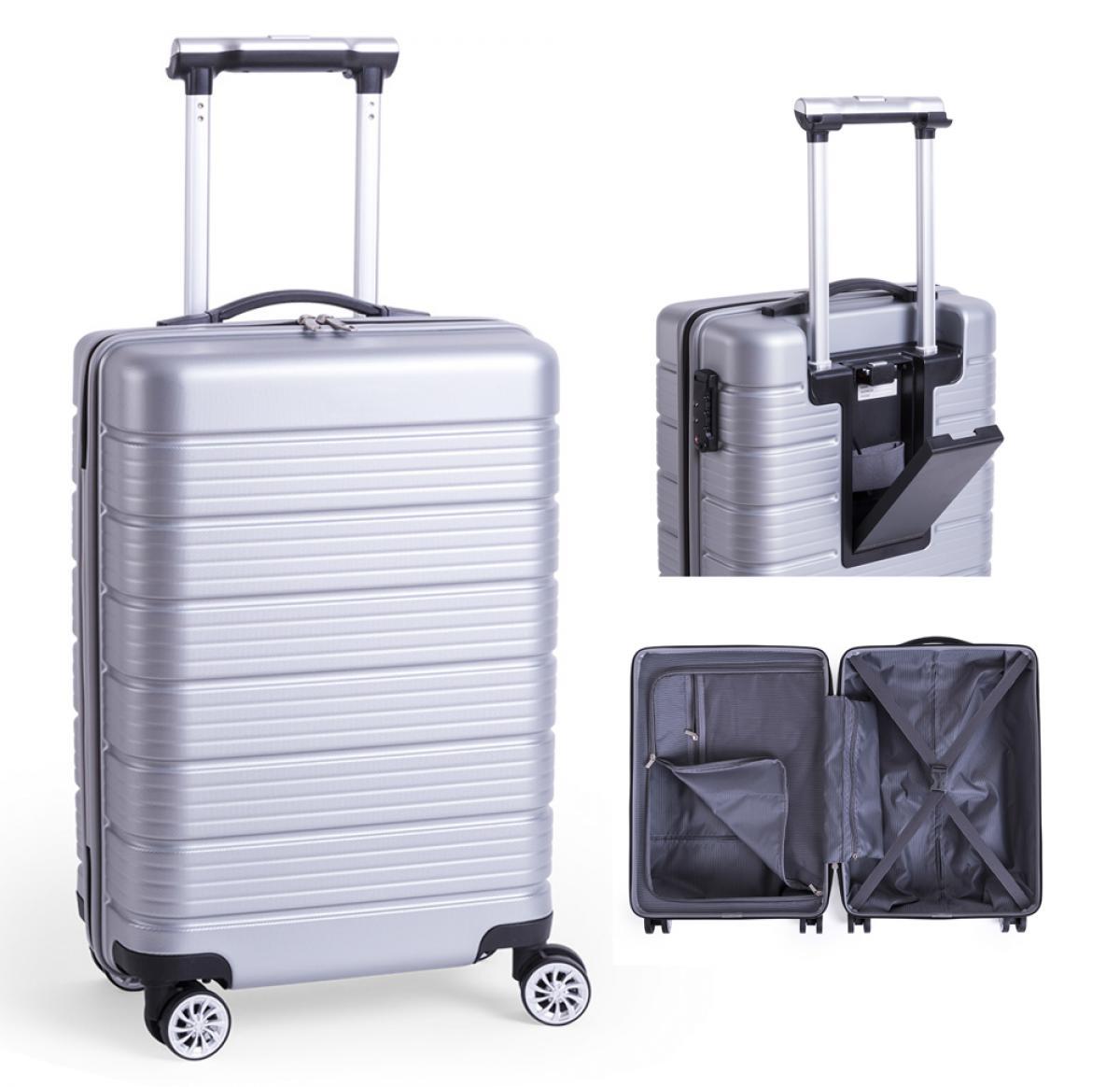 Hard shell, rigid business trolley made in durable ABS material with four rotating wheels for easy transporting. This multi-functional travel case has a main zipped compartment with a built-in combination lock. The smaller rear compartment is perfect for easy access to passports and travel documents and contains a compartment for your powerbank, with a USB connection, for you to charge your devices on the go. The retractable handle doubles up as a tablet or phone stand and can also hold shopping or handbags.