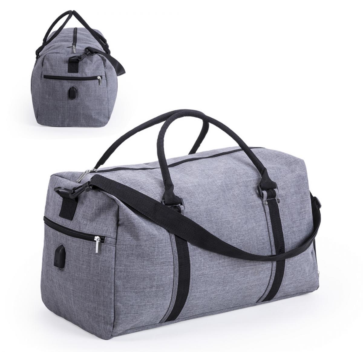 Grey denim look multi-purpose bag in resistant style 600D polyester, designed with a zipped side pocket and a side shoe compartment. The modern style has a built-in USB connection for use with a power bank (not supplied) and is easily transported with two carry handles and a detachable shoulder strap.