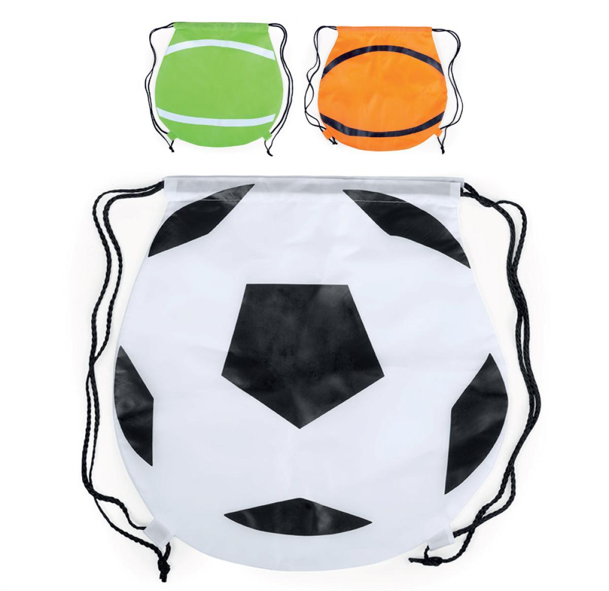 Bold design drawstring backpack with sports designs. In 210D polyester material, with reinforced corners and available in 3 designs: football, basketball and tennis.