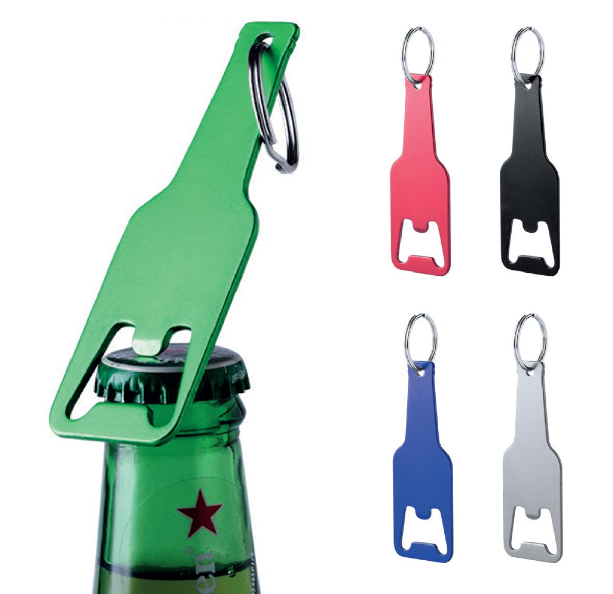 Bold design keychain opener with bottle design, in a varied range of vivd metallic colours. Especially designed for laser printing.