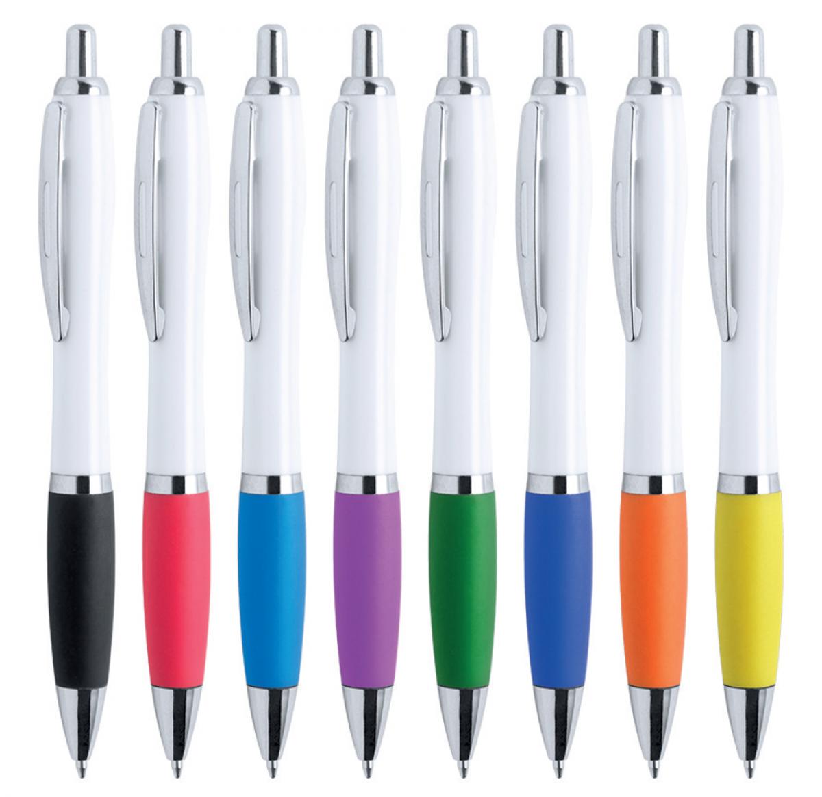 Ball pen in a vivid, bicolour design, with body in white colour and grip in a wide range of eye-catching colours. Push-up mechanism, with chromed details, metal clip and blue ink.